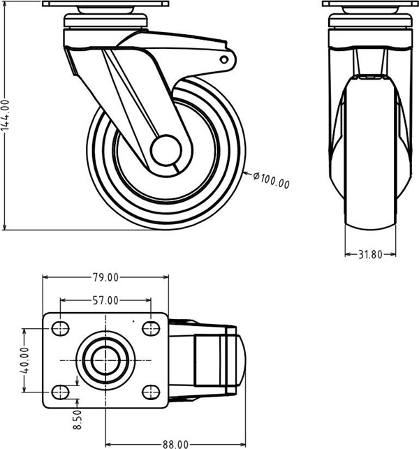 57系列腳輪主架和輪芯采用高強度聚酰胺制材質,美觀,防腐,防生銹,轉動部分均采用精密滾珠軸承結構、轉動靈活靜音,承載性能好,保證了腳輪的使用壽命,輪胎面采用超靜音TPE材質注塑成型,耐磨、耐沖擊、承載大整體靜音耐磨、轉動輕巧靈活,彈性好