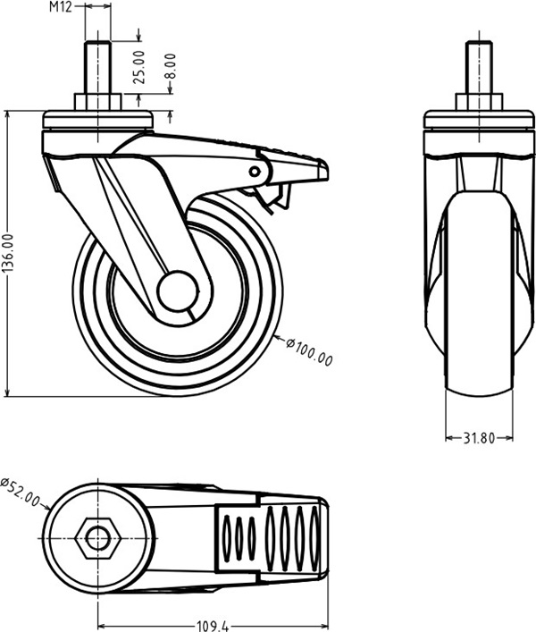 57系列腳輪主架和輪芯采用高強度聚酰胺制材質, 美觀,防腐,防生銹,轉動部分均采用精密滾珠軸承結構、轉動靈活靜音,承載性能好,保證了腳輪的使用壽命,輪胎面采用超靜音TPE材質注塑成型, 耐磨、耐沖擊、承載大整體靜音耐磨、轉動輕巧靈活,彈性好